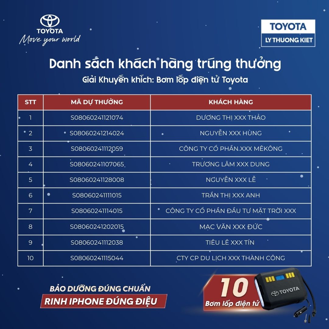 Xin chúc mừng các khách hàng sau đây đã trúng Giải khuyến khích: Bơm lốp Toyota.