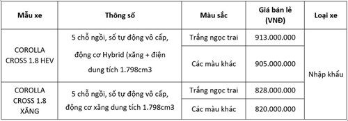 Mẫu xe Corolla Cross 2024 sẽ có mặt tại hệ thống đại lý Toyota trên toàn quốc vào ngày 06/05/2024 với giá bán lẻ như sau: