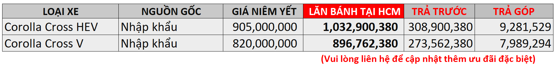Bảng giá Toyota Corolla Cross tại Toyota Lý Thường Kiệt: