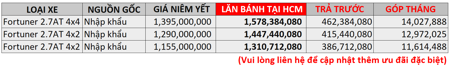 Bảng giá Toyota Fortuner mới tại Toyota Lý Thường Kiệt: