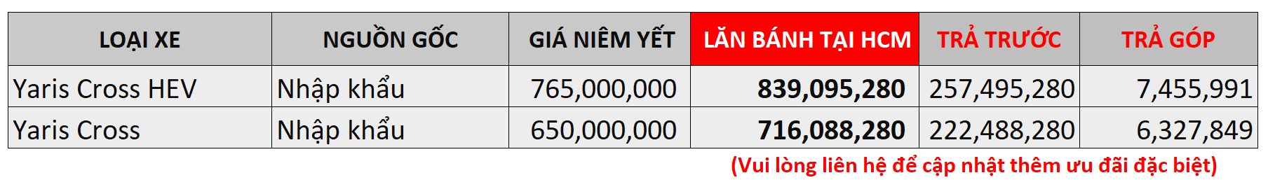 Bảng giá Toyota Yaris Cross tại Toyota Lý Thường Kiệt: