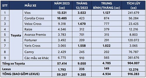 Trong năm 2023, Toyota Việt Nam đạt doanh số 59.207 xe (bao gồm Lexus), nâng tổng doanh số tích lũy đạt trên 916.000 xe. Trong đó, thương hiệu Lexus đạt doanh số kỷ lục kể từ khi ra mắt với 1.793 xe, nâng tổng số xe tích lũy lên hơn 12.000 xe.
