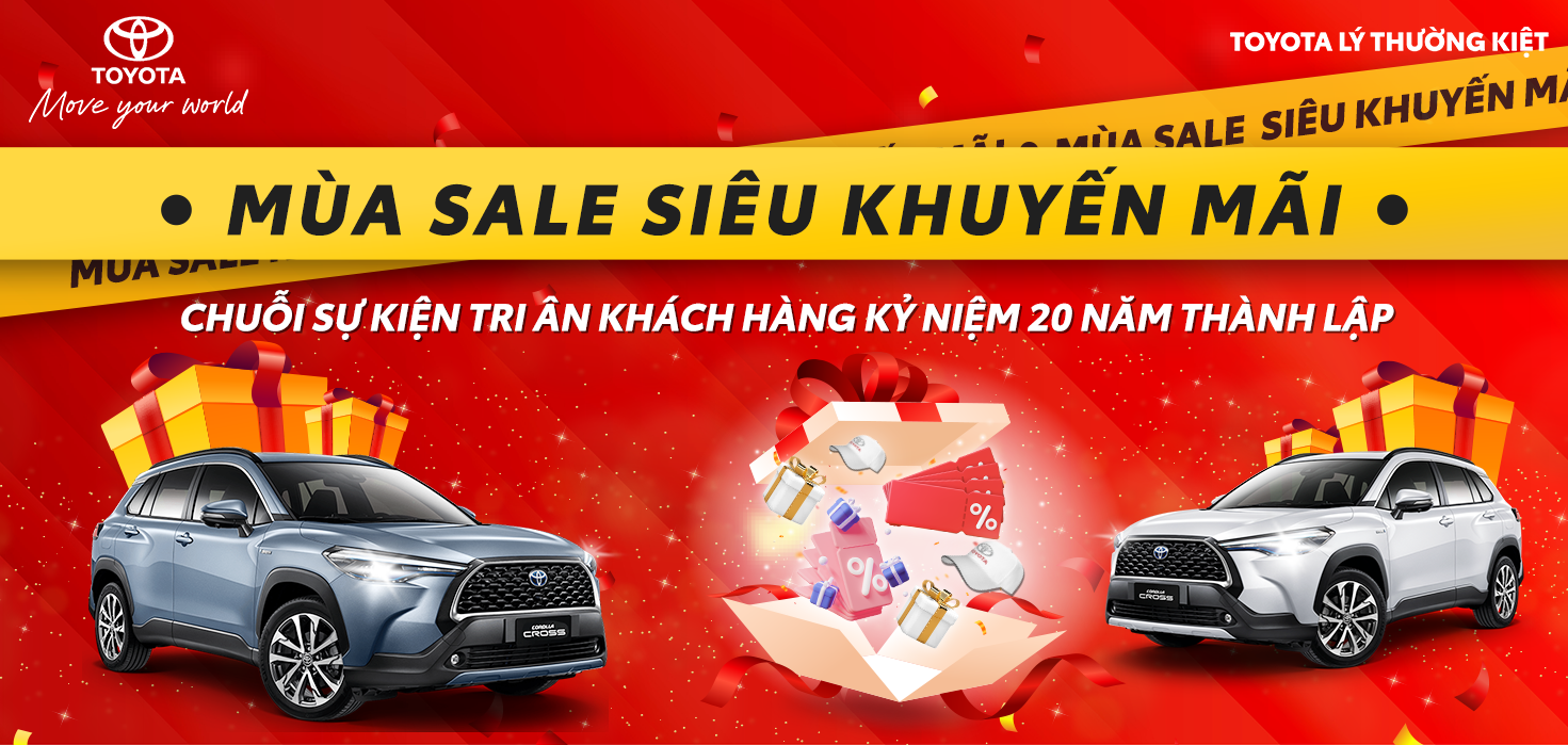 Nhằm tri ân khách hàng kỷ niệm 20 năm thành lập công ty, Toyota Lý Thường Kiệt xin gửi đến quý khách hàng chương trình “Mùa sale siêu khuyến mãi" với những ưu đãi đặc biệt cho dòng xe Toyota Corolla Cross 2022.