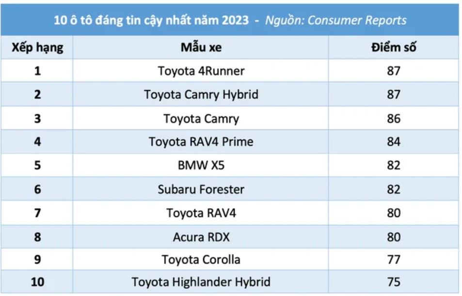 Kết quả Consumer Reports, xe Toyota áp đảo áp đảo danh sách 10 ô tô đáng tin cậy nhất năm 2023, khi hãng xe Nhật có đến 7/10 mẫu xe góp mặt trong danh sách này. Cụ thể, 4 vị trí đầu tiên trong bảng xếp hạng 10 ô tô đáng tin cậy nhất năm 2023 do Consumer Reports công bố đều do các mẫu xe Toyota nắm giữ, gồm Toyota 4Runner (87 điểm), Toyota Camry Hybrid (87 điểm), Toyota Camry (86 điểm) và Toyota RAV4 Prime (86 điểm).