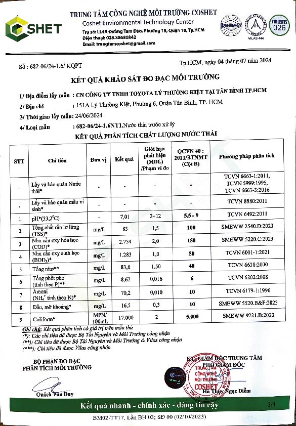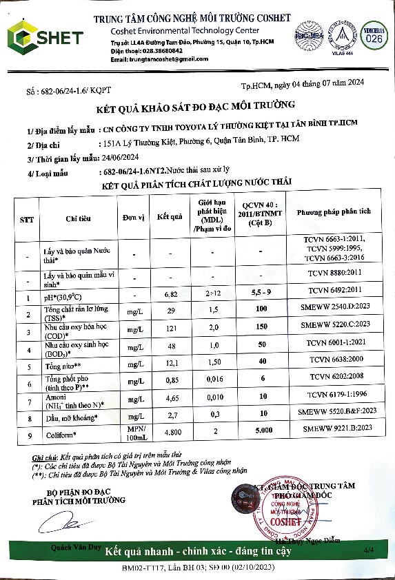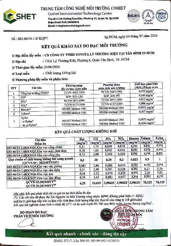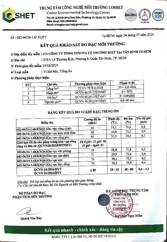 Chi nhánh Công ty TNHH Toyota Lý Thường Kiệt tại Tân Bình TP.HCM công khai kết quả khảo sát đo đạc môi trường như sau: