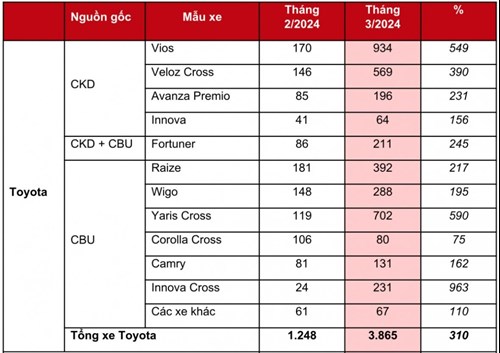 Sau đây là thống kê chi tiết tình hình kinh doanh của Toyota Việt Nam trong tháng 3/2024: