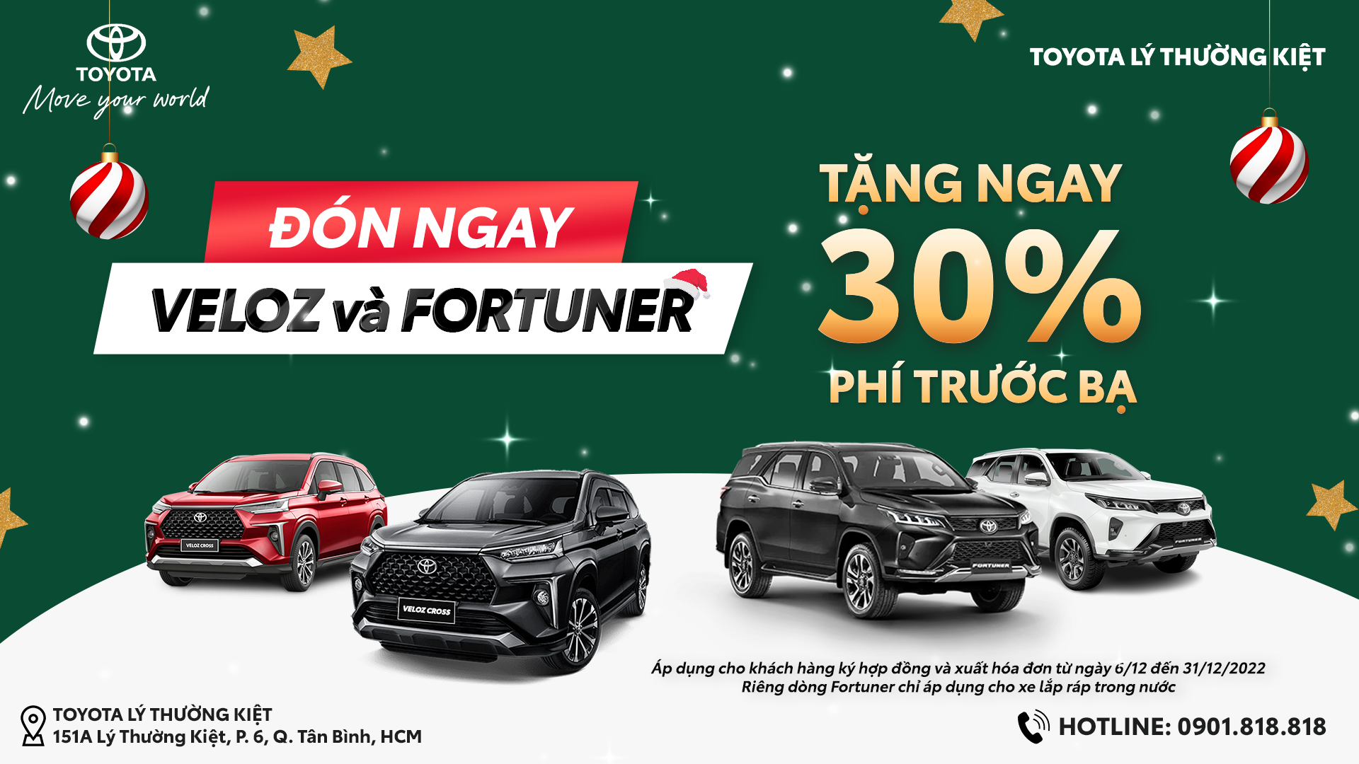 Ngoài ra, Toyota Lý Thường Kiệt còn tặng thêm cho quý khách hàng 30% phí trước bạ dành riêng cho 2 mẫu xe Fortuner và Veloz Cross.