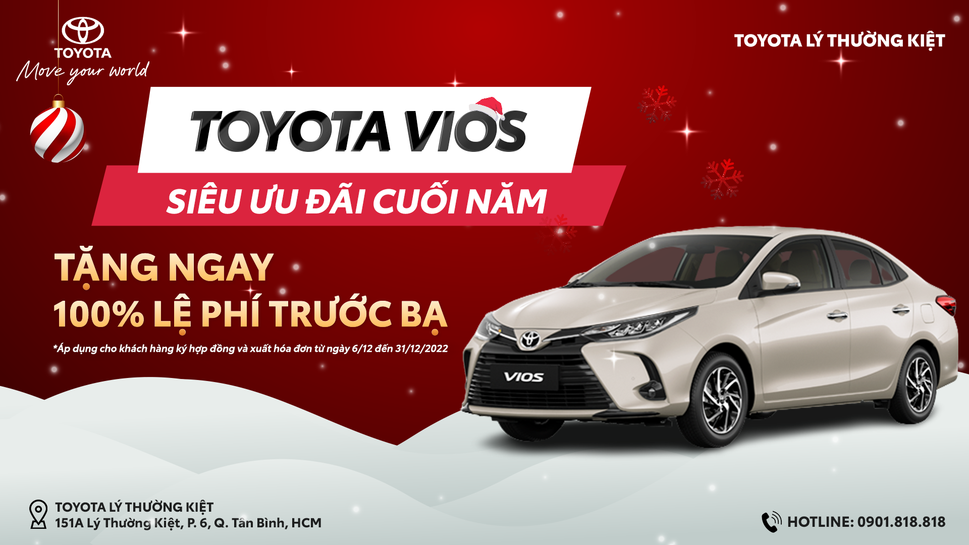 Toyota Lý Thường Kiệt đang có khuyến mãi cực HOT cho dòng xe Vios trong tháng 12 cuối năm với mức TẶNG 100% PHÍ TRƯỚC BẠ kèm nhiều quà tặng hấp dẫn và rất nhiều phụ kiện có sẵn với chất lượng chính hãng. Cuối năm nay chính là thời điểm thích hợp nhất để rinh ngay Toyota Vios về nhà với giá cả rất hợp lý!